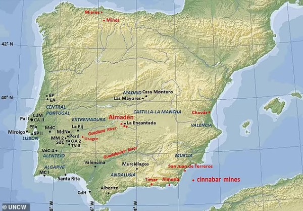 Lo interesante es que el cinabrio empleado en el dolmen de Montelirio (Sevilla) tiene un origen desconocido, su cámara principal, donde se hallaron cuerpos, estaba recubierta de una pátina roja de cinabrio, pero sus muestras isotópicas de plomo obtenidas no coinciden con ninguno de los yacimientos minerales estudiados. En los huesos de los cuerpos se han detectado “elevadísimos niveles” de mercurio, esto significa que estaban expuestas continuamente al cinabrio o porque la piel estaba pintada por el cinabrio.