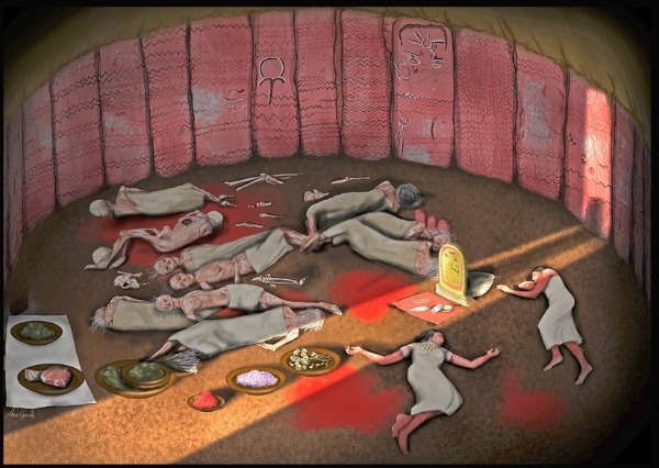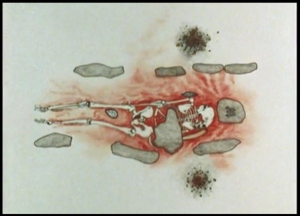 Lo mismo ocurría en los esqueletos de Grimaldi que presentaban brazos y piernas flexionados y pintados en ocre y la arenisca roja sobre la que se apoyaba la cabeza estaba embadurnada con peróxido de hierro rojo. Los hombres de Cromagnon, Chancelade y Obercassel, todos tienen manchas rojas en los huesos. La cabeza del viejo Cromagnon de La Grotte des Enfants y la de la mujer junto a él, reposan sobre una losa roja. Cerca está la Cueva de Cavillon, donde un esqueleto de varón de 1.84 m. de altura, está todo pintado de rojo. Igual sucedía a los huesos de los "kurgan" del Sur de Rusia.