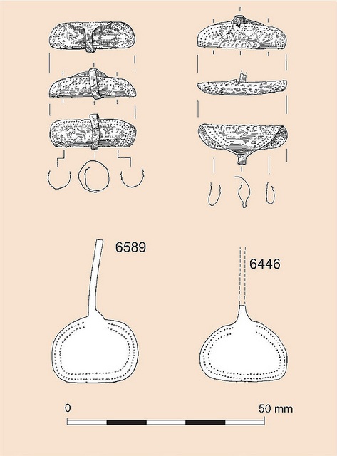 Aunque los adornos de oro son de un tipo que se encuentra sobre todo en Gran Bretaña y, ocasionalmente, en Europa continental podrían tener un origen ibérico (Armbruster y Comendador Rey, 2015) (fig. 7). Una muestra de esta posible conexión serían los adornos de oro hallados en tablada del Rudrón, Burgos, España (Fitzpatrick et al., 2016), y la huella química del oro no se puede contrastar con fuentes de Gran Bretaña o Irlanda, así que tiene que provenir de la Europa continental.