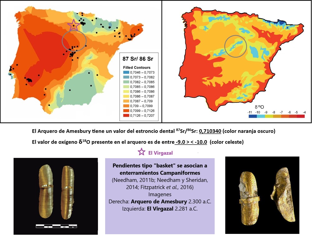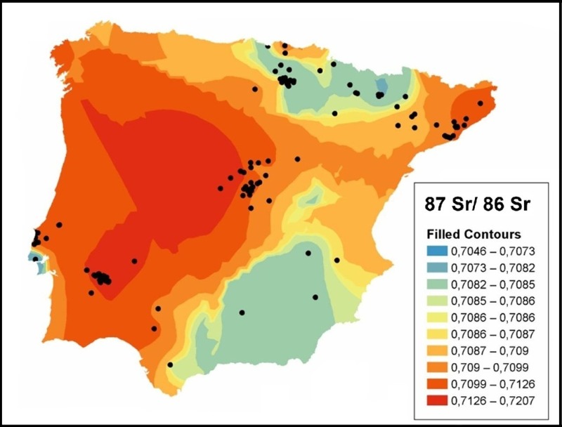 La zona geográfica más adecuada para ofrecer tal valor debería tener un subsuelo más granítico o fracturado, en consecuencia, una emisión de rubidio más elevada. El 87Sr se forma por la desintegración radiactiva del 87Rb y se acumula lentamente a lo largo del tiempo geológico, y esta zona óptima para esos niveles de isotopos de estroncio y oxigeno puede darse en la meseta ibérica (ver mapa), cerca de hallazgos como los pendientes tipo “basket” del Virgazal, demasiado cerca como para pasarlo por alto.