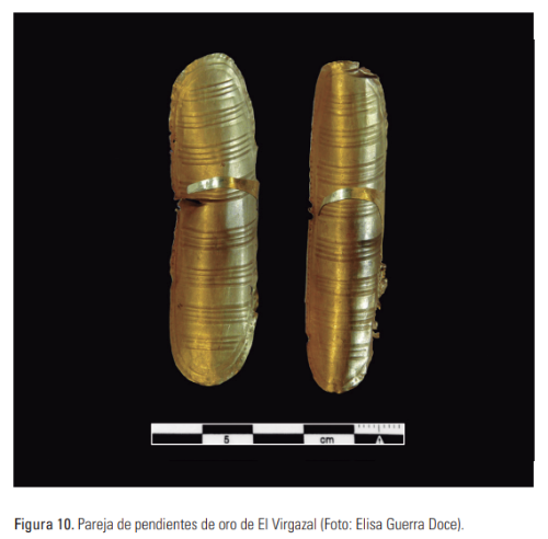 Tiende a admitirse una inspiración del modelo en los pendientes centroeuropeos “en hoja de sauce” (Taylor, 1980: 22; Gimbutas,1965: 39-45), pero en rigor se trata de un tipo de distribución exclusivamente atlántica, del que se conocen poco más de treinta ejemplares: 22 procedentes de Inglaterra, la mayoría de la región sureña de Wessex, 3 de Irlanda, 1 de Escocia y 6 de las costas del resto del continente. Tres de estos últimos son hallazgos costeros, son portugueses (2 piezas de Ermegeira y 1 de Estremoz: Hernando, 1983: 100), pero se trata de adornos de lámina casi redonda en vez de oval, planos en vez de tubulares y con decoración mucho más sencilla, correspondientes al tipo A de la clasificación de Needham (2011). Los de El Virgazal, encontrarían mejores paralelos decorativos en los pendientes ingleses de esta tumba del “arquero”, la práctica totalidad de los “basket-shaped gold ornaments” bien contextualizados de Inglaterra: el “arquero de Amesbury”, el “Compañero del Arquero”, y los señores de las tumbas también campaniformes de Chilbolton, Kirkhaugh y Radley (Fitzpatrick et al., 2016), además de aparecer en parejas lo hacen invariablemente en sepulturas de varones adultos.