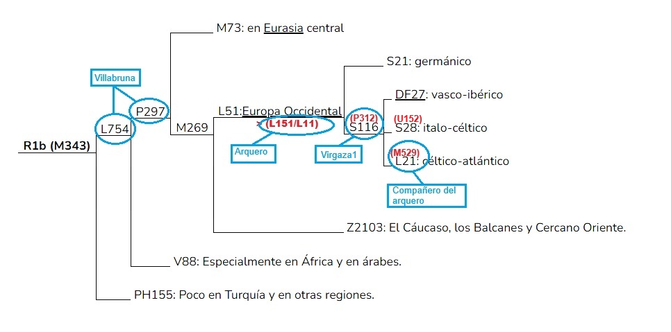 Aguas debajo de P312/S116 estarán sus descendientes DF27 vasco-ibérico; S28 italo-céltico y el L21 atlántico (conocido también como M529, o S145), y a este último es al que pertenece el “compañero” del arquero de Amesbury, muy común ahora en las Islas Británicas e Irlanda