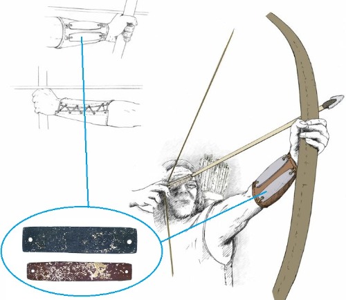 Entre los restos hallados en la tumba del Arquero de Amesbury se encontraron dos brazales (protectores de muñeca). Uno, de color rojo, se halló a la altura de las rodillas, y otro, negro o gris oscuro, junto al antebrazo izquierdo. Las dataciones por radiocarbono más antiguas de brazales similares corresponden a artefactos de la península ibérica, en Wessex Archaeology sugieren que los brazales podrían tener su origen en esta región. (Wessex Archaeology 2002 https://www.wessexarch.co.uk/news/amesbury-archer-20-years )