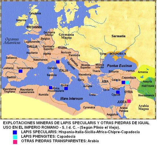 <<...Efectivamente, estas piedras se pueden cortar; en cambio, la especular a la que también se califica de piedra, tiene unas características que permiten cortarla con mayor facilidad en láminas todo lo finas que sequiera. Antiguamente sólo se encontraba en la España Citerior, y no en toda ella, sino exclusivamente en un área de cien mil pasos alrededor de la ciudad de Segóbriga...>> (Plinio el Viejo, Historia Natural, Libro XXXVI,pág. 160). (100.000pasos = 147,9km)