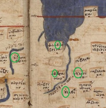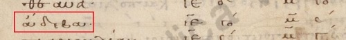 En la imagen de arriba: δHοῦα , sonido [deua] -α, H (la eta mayúscula es una e larga), oῦ es el sonido [u]. (δηοῦα Ptol.Geog.2.3.11) (a Deua le sigue Desembocadura de rio)
