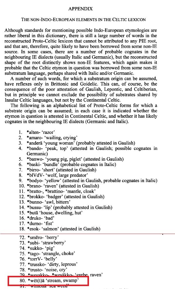 Uno de estos términos NO Indo-europeo del proto-celta es *wet(t)a que es Arroyo, Pantano; Irlandes medieval: feith es arroyo, pantano; Gales medieval gwyth es canal, nervio, vena, zanja; Breton antiguo goed es arroyo; Breton medieval goaz, guez. Breton moderno gwazh es arroyo; Cornico antiguo Guid es vena, Cornico medieval Gwyth.
