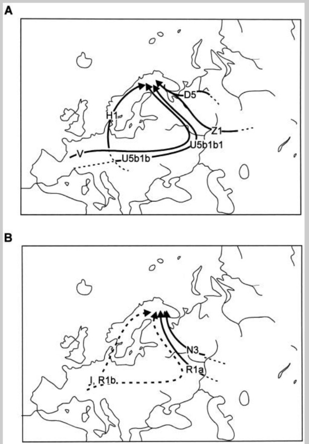 Como se puede ver en este estudio del haplogrupo U5b, el H1 y V, en Escandinavia, estos grupos se debe a su expansión del Pleistoceno tardío/Holoceno temprano desde un refugio glacial franco-cantábrico. (https://www.ncbi.nlm.nih.gov/pmc/articles/PMC1181943/ )