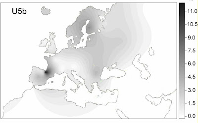 U5b se habría concentrado más en la región franco-cantábrica. Podemos deducir esto del hecho de que los europeos occidentales modernos tienen considerablemente más U5b que U5a, pero también porque los vascos y cántabros modernos poseen casi exclusivamente linajes U5b. Además, todas las muestras mesolíticas U5 de Iberia cuyo subclado pudo identificarse pertenecían a U5b.