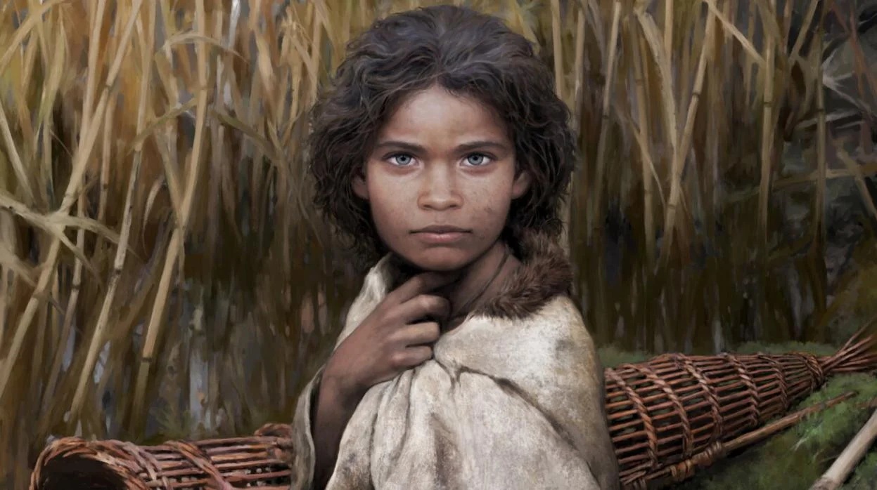 (Arriba imagen de LOLA, niña Dinamarca 5700 años, de piel oscura, cabello castaño oscuro y ojos azules)