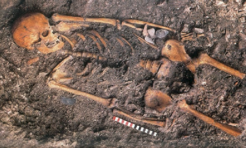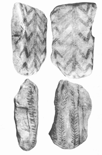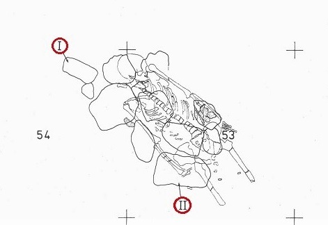 Fig. La posición de las piedras que cubrían el pozo en relación al esqueleto, las piedras decorado con motivos (I y II).