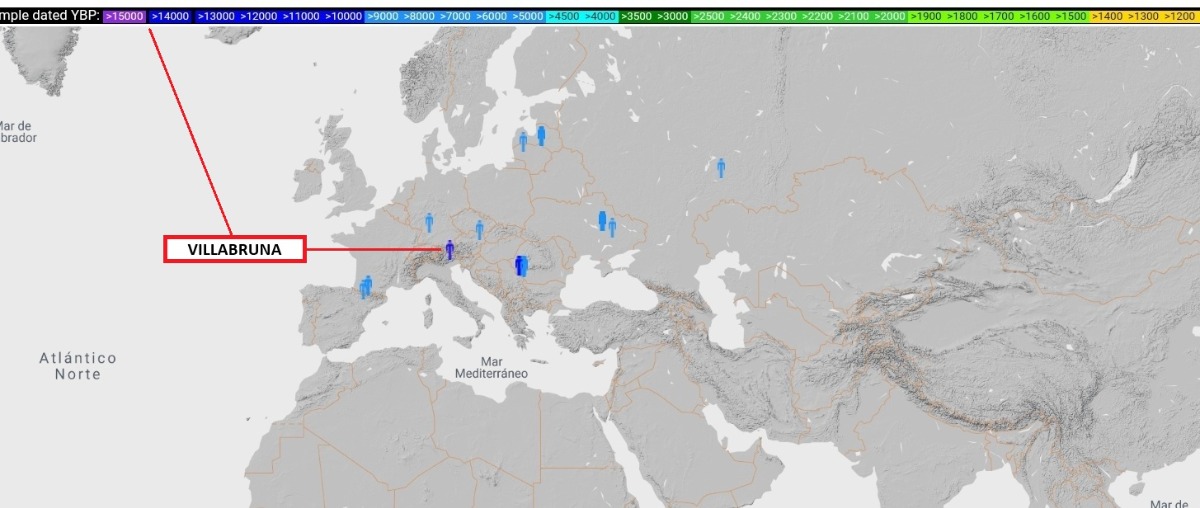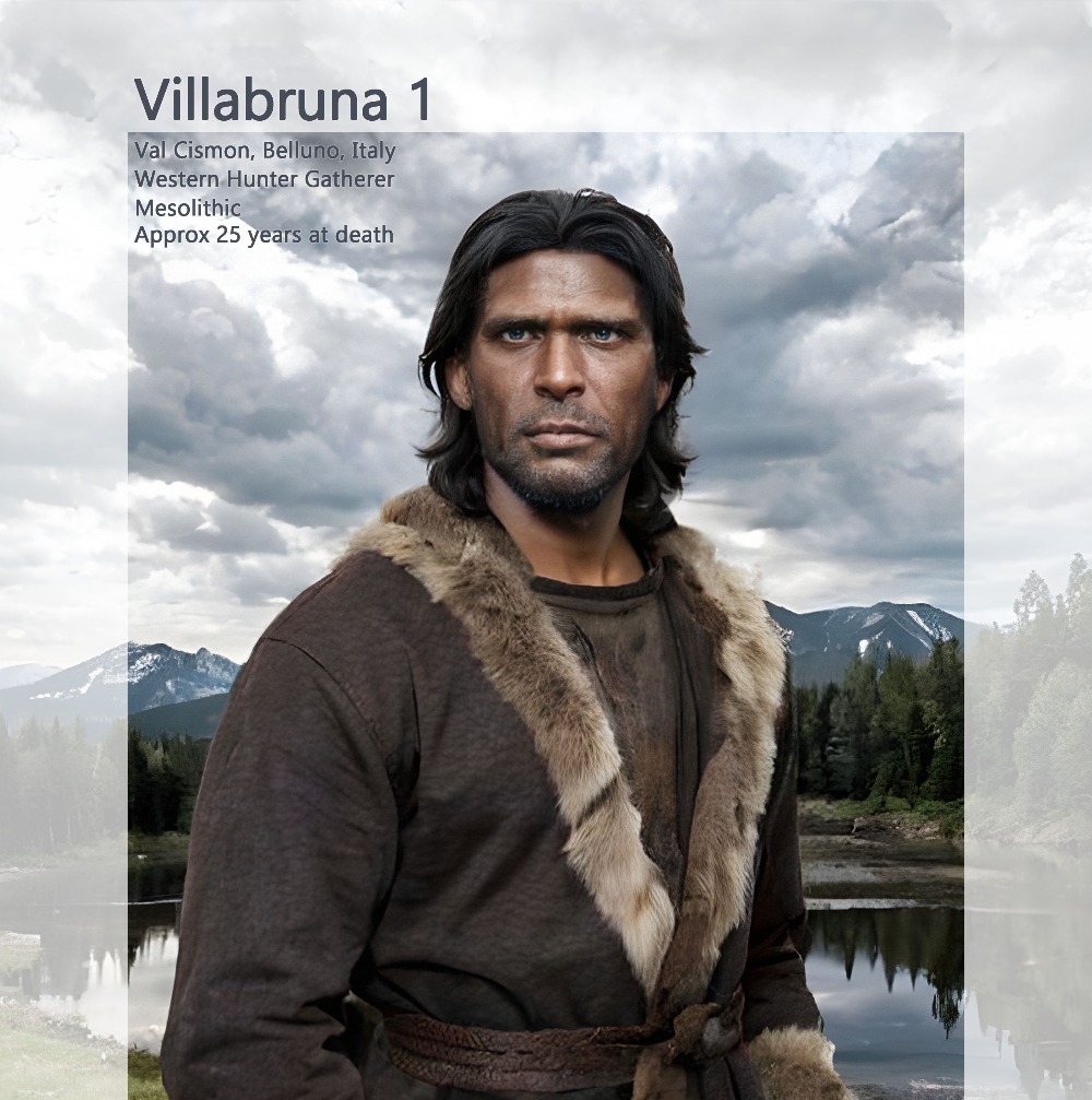 Villabruna1 lo llamaron, era un individuo masculino adulto joven, con piel morena y ojos azules de unos 25 años, fue enterrado bajo un refugio rocoso utilizado ocasionalmente por cazadores-recolectores del Paleolítico superior tardío de la región alpina que pertenecía a la cultura epigravetiense. La datación directa AMS de los restos esqueléticos reveló una edad de 14.160 a 13.820 años. El enterramiento se produjo durante las primeras etapas del asentamiento humano en aquel abrigo rocoso.