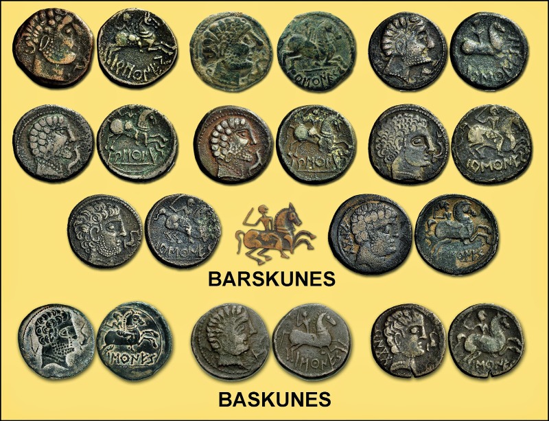 Creo que esta primera se acuñaba un poco más lejos de Pamplona, en la “difusa” frontera oeste del territorio vascón. Pero primero vamos a ver que significa barrśkunes, que nada tiene que ver con el término "vascones", aunque sea una ceca acuñada por los ellos.