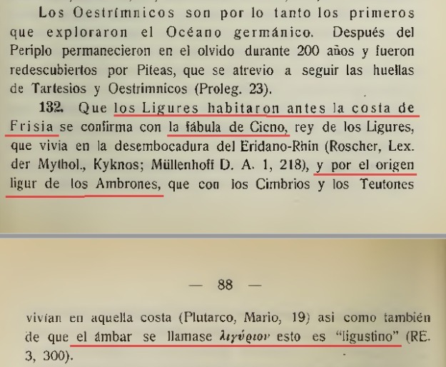 Schulten cita una fábula de Cicno (rey de los Ligures) que vivió en la desembocadura del Eridano-Rin; hace referencia el historiador a Plutarco, y que según este son de origen Ligur: los Ambrones, Cimbrios y Teutones, que vivían en aquella costa del mar del Norte. La costa de Frisia debió ser ocupada por los Celtas en el siglo VII. De esa zona es el ámbar europeo y que se llamaba “λιγούριον” (ligustino) y que aparece en las tumbas principescas hallstaticas. También gran número de topónimos se creen ligures y llegan hasta las bocas del Rin.