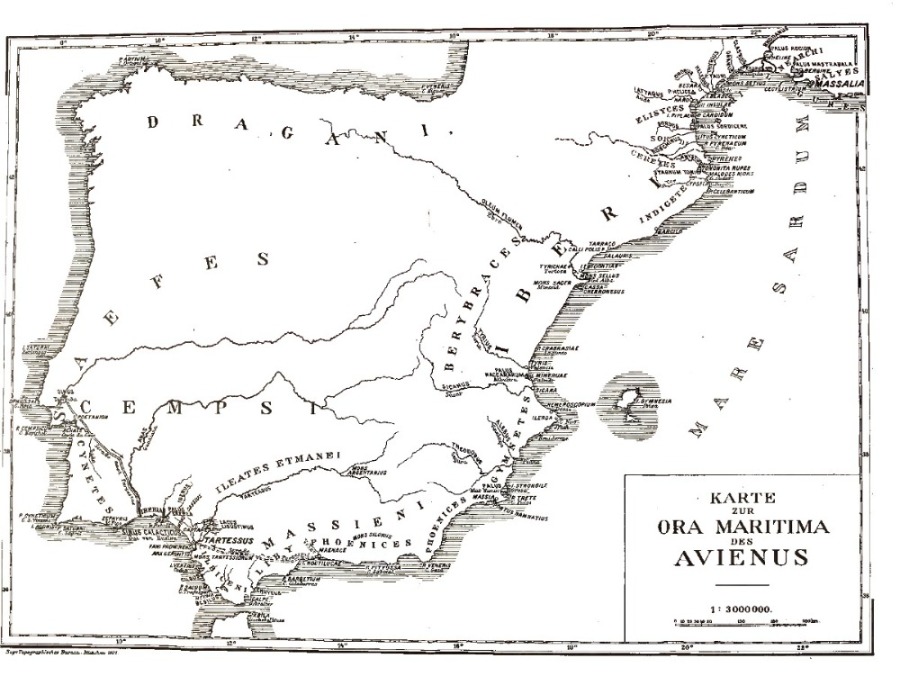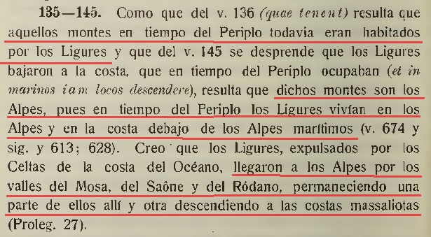 <<Si alguien se atreve a navegar desde las islas de Oestrymnicus hacia las olas, en cuyo eje se congela el aire de Licaón, el territorio de los ligures sufre la ruina de sus habitantes. Pues los campos han estado vacíos desde hace mucho tiempo por la mano de los celtas y las frecuentes batallas. Y los ligures, expulsados, como suele ocurrirles a algunos, llegan a estos lugares, que controlan en su mayor parte a través de bosques espantosos. En estos lugares de escrúpulos, rígidos acantilados y amenazas montañosas se insertan en el cielo. Y esta esquiva nación, de hecho, pasó mucho tiempo entre estrechas calas, oculta de las olas. Porque temiendo la sal, antes había temido el peligro, pero tras la paz y el descanso, la seguridad fortaleció su audacia, la persuadió a ser transportada en lechos altos y ahora a descender a lugares marítimos.>>
