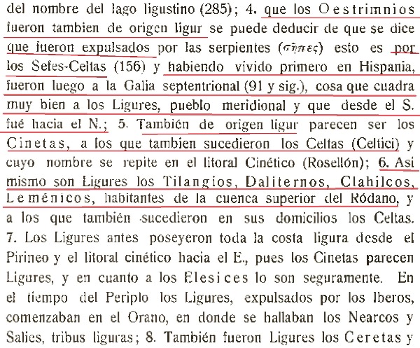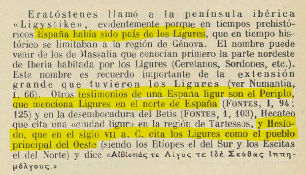 Esa afirmación de Schulten de que el pueblo primitivo de la Península es el Ligur, se apoya en un pasaje de Hesíodo que en el siglo VII a.C. quien llama el Ligues (Ligur) a todo el occidente europeo. Erastótenes, un geógrafo que ya en el siglo III a.C. calculó el diámetro de la Tierra con un error menor al 1%, también nombra a Hispania como Ligústica. Avieno habla en la Bética del “Ligustinus lacus” y pone en parte de Galicia y en Portugal a los Oestrimnios, de nombre idéntico a los Ligures de Bretaña.