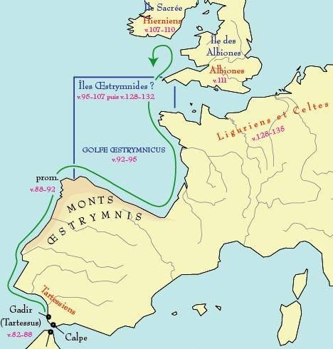 El texto de Avieno confirma a los Ligures en el Occidente, acompaña al texto de Hesíodo. Los Hiernos y los Albiones, habitantes antiquísimos de Hibernia y Britannia, fueron probablemente Ligures y a ellos corresponde el nombre primitivo de Albion, que parece ligur; después de ellos los Celtas al ocupar la Britannnia se llamaron con otro nombre.