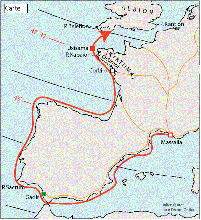 La descripción de Escimno sobre la “columna Boreal” no cuadra con la isla Uxisama, hoy llamada isla de Ouessant. Más acertado sería una localización cercana a los acantilados como los de Kerbonn, que esconde el tranquilo fondeadero de Brest en su gran bahía interior. La etimología celtica de Uxisama es errónea, al ser traducida como la “altísima”, puesto que es una isla muy poco elevada, no tanto como para ser referente geográfico en navegación. Pero lo que sí nos da una pista de su significado real es que cuenta con agua dulce en su interior. Su significando es Contenedor Marino de Agua (*uk-is-ama>>uxisama), estando emparentado con el baskonico y el ligur, donde -am-/-ama es raíz de infinidad de hidrónimos.