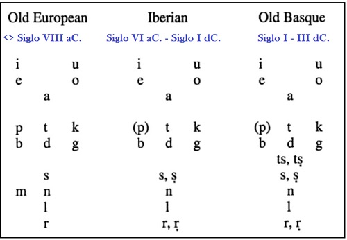Theo Vennemann de la PALEOLENGUA EUROPEA anterior a los celtas, en su publicación “LINGUISTIC RECONSTRUCTION IN THE CONTEXT OF EUROPEAN PREHISTORY”, hace un inventario consonántico del Europeo Antiguo (al que llama Bascón-Europeo) propone 6 oclusivas (p, b, t, d, k, g), SOLO UNA SIBILANTE fricativa sorda (s), dos velares (m, n, con una variante asimilatoria velar ante oclusiva velar), y dos líquidas (I, r) más las glides (j, w). No hay seguridad sobre la labiovelar sorda, ya que al existir secuencias prevocalicas su-, etc., pudo ser simplemente una secuencia ku- (Cc).