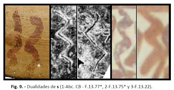 La posible “trialidad” que nos avanza Ferrer para las sibilantes en la escritura paleohispánica original, también nos abre la posibilidad que no fueran diferentes fonemas sino un “complejo fónico”, variantes vocálicas o silábicas complejas, puesto que muchos segmentos con esta sibilante Q (S1) no son entendibles sin el apoyo de una vocal. No puede descartarse la posibilidad de que las sibilantes también tuviera su/s dualidad/es, como se aprecia en T.00.02.