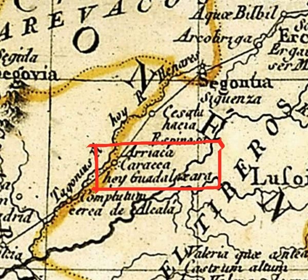 José Antonio Ranz Yubero en «Los nombres Arriaca, Alcarria y Guadalajara: su etimología, significado y otras particularidades», indica que el topónimo ARRIACA se relaciona con la forma ARRIA (piedra) del euskera. Cuando los árabes se asentaron en la región la llamaron ALWADI ALHIJARA (Valle de Piedras). Supongo que en el siglo XVIII alguien les dijo lo que significaba Arriaka o Karaka.