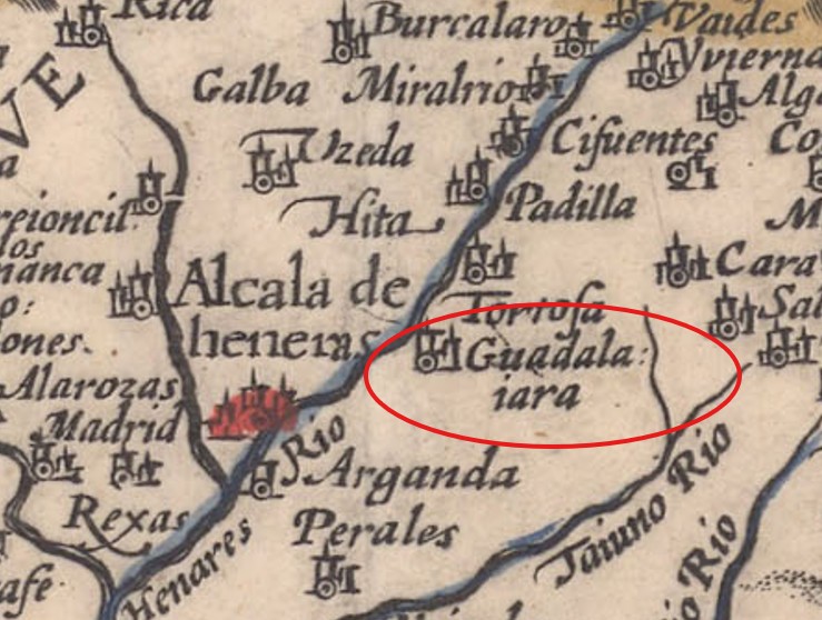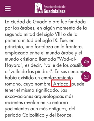 La ciudad de Guadalajara explica en su web oficial lo siguiente: <<fue fundada por los árabes,,, en principio, llamada "Wad-al-Hayara", es decir, "valle de los castillos" o "valle de las piedras". En sus cercanías había existido un emplazamiento romano, cuyo nombre, ARRIACA, puede tener el mismo significado.>>