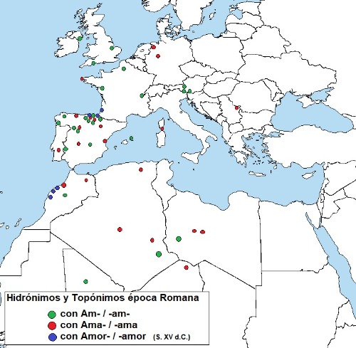 Alejados ya en el tiempo estarían, en ÉPOCA ROMANA: la Aquitánica según Avieno anteriormente era llamada Aremórica. El Portus AManum situado entre el rio Deua (Deba) y el rio Nerua (Nervion) junto a Flaviobriga (Forua). AMbisna entre el pueblo de los Musburgi (al norte de los Pelendones). IAMna en la Menorca romana. DAMania junto al rio Turia valenciano. La división gallega entre los Artabros y los Cilinis estaba marcada por el rio TAMara. AMmaia (Amaillobriga) en el C. Pacensis. Entre los Vaceos la ciudad ParAMica o KAMarika. Entre Cantabros y su famosa “Fontes Tamarici” que cita Tolomeo y (a)Maliaca (peña Amaia). LAMinium en el rio Jabalón. En la Europa romana: Rio AMAsus (Ems en alemán/ Eems en neerlandés) en Germania. Ciudad y Rio TAMarus y rio TAMesun en la británica; cabo IsAMnium en la Irlanda romana. Ambianos en las riberas del Somme, con capital en Samarobriga y hoy Amiens. El Portus Namnetum hoy Nantes. Ciudad costera AMAsa al sur de la isla Córcega. Los AMatini vivían entre los ríos Drava y Sava. Los AMbílikoi (Ἀμβίλικοι, Ptolomeo), AMbisontis, AMbidrani al sur de Austria (a ambos lados de los ríos). Los AMbarros ocupaban una zona en el valle del rio Ródano.